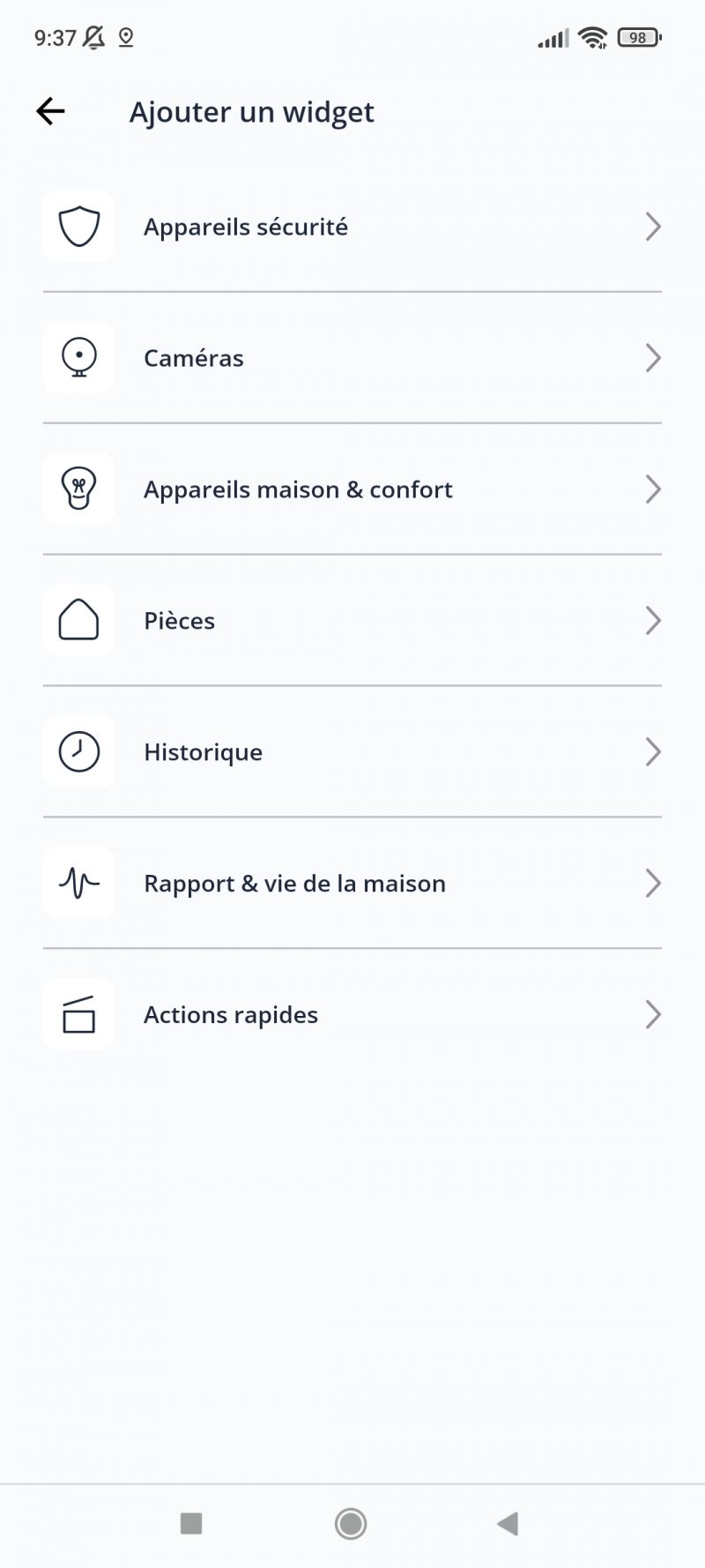 En cliquant sur “Ajouter un widget” au milieu de l’interface principal, vous allez pouvoir ajouter des raccourcis vers les fonctions qui vous sont le plus utiles, que ce soit à l’historique des événements, aux lampes de la cuisine et du salon et aux informations sur la cuisine (objets et événements). C’est le vrai plus de cette application : un œil rapide sur le plus important.