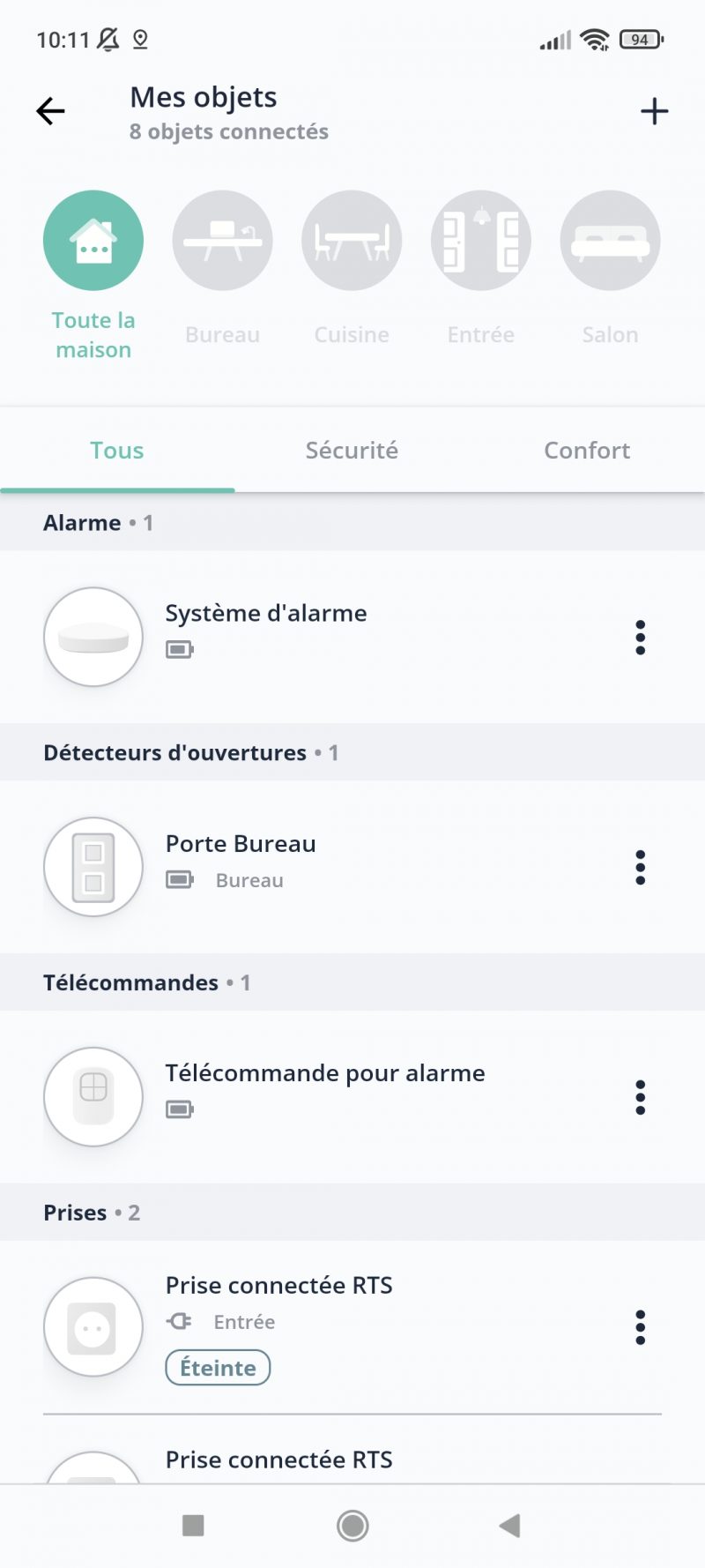Depuis la section objets connectés, vous accéderez à différents dispositifs, avec un tri par pièce (toute la maison, bureau, cuisine, entrée, salon) ou par type (tous, sécurité ou confort), avec des icônes très explicites. Nous avons d’ailleurs retrouvé nos objets déjà configurés par le passé.