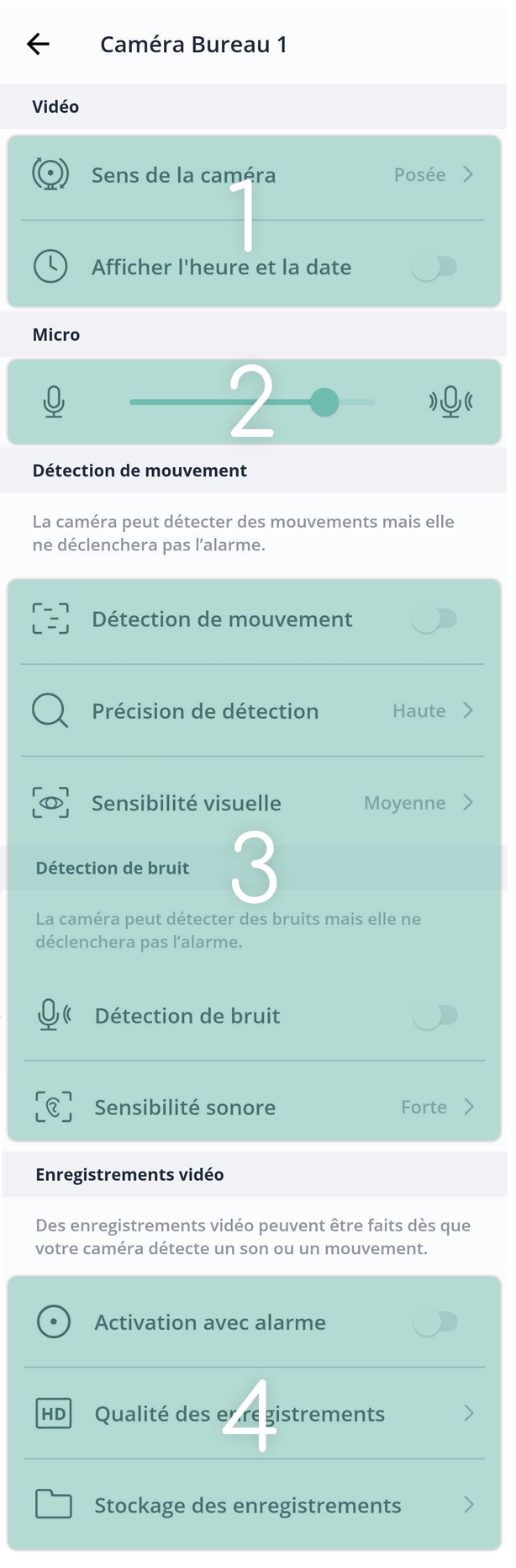 3 Activer l’enregistrement à la détection de mouvements et/ou de bruits. Attention, la détection de mouvements et de bruit de la caméra ne permettent pas de déclencher l’alarme, précise l’assistance Smart Home.