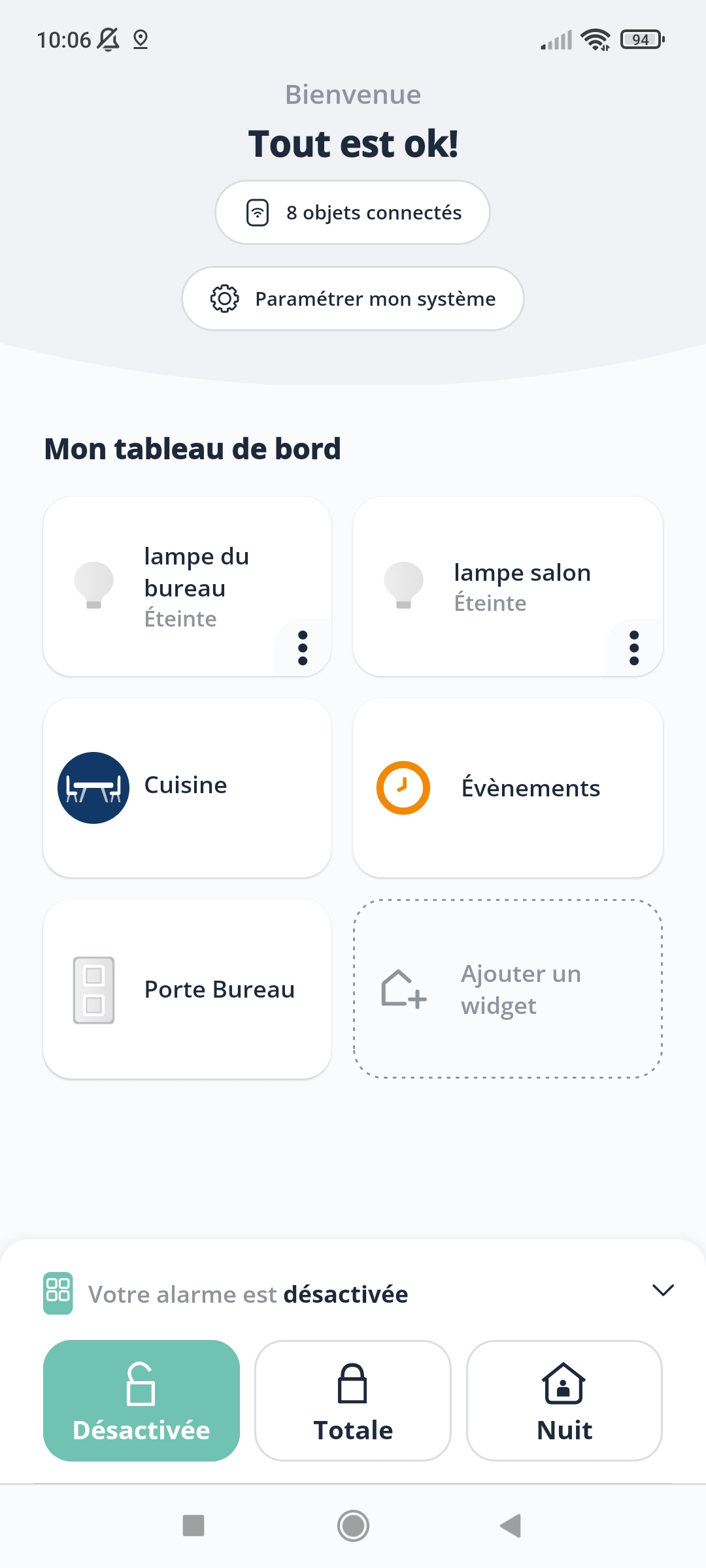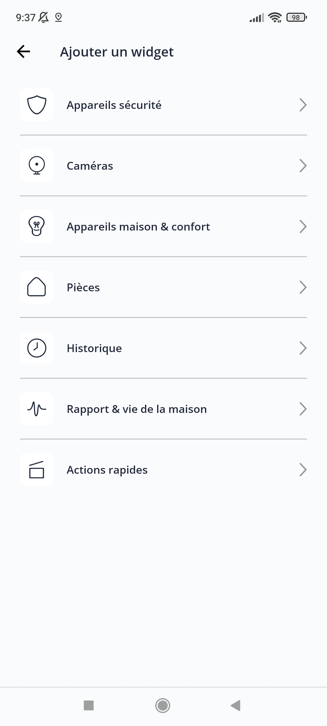 En cliquant sur “Ajouter un widget” au milieu de l’interface principal, vous allez pouvoir ajouter des raccourcis vers les fonctions qui vous sont le plus utiles, que ce soit à l’historique des événements, aux lampes de la cuisine et du salon et aux informations sur la cuisine (objets et événements). C’est le vrai plus de cette application : un œil rapide sur le plus important.