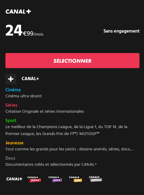 La première offre sobrement intitulée Canal+, formule de base de la filiale de Vivendi, est ainsi facturé 24.99€/mois sans engagement, ou 20.99€/mois la première année puis 24.99€/mois dans le cas d’une offre avec engagement.