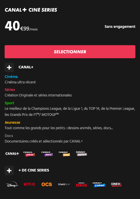 Pour les fans de séries ou de grand cinéma, la chaîne cryptée lance donc son offre dédiée, avec l’ensemble des cinq chaînes canal+ de base, mais aussi l’accès à Canal+ Cinéma, Ciné+ Disney+ (4 écrans UHD), OCS, StarzPlay mais aussi Netflix dans sa formule Standard (soit deux écrans et définition HD).