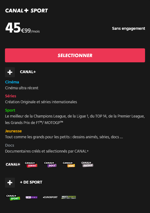 Arrive enfin la formule pour les amateurs de football, rugby ou sports automobile, l’offre Canal+ Sport propose l’accès à de nombreux contenus pour les amateurs de sensations fortes. En plus des cinq chaînes “basiques,” cette offre propose donc l’accès à la chaîne éponyme Canal+ Sport, mais aussi aux diverses déclinaisons de Bein Sport, Eurosport et inclut également Multisports dédiée à de grands évènements sports regroupant Foot+, Golf+ et Rugby+.