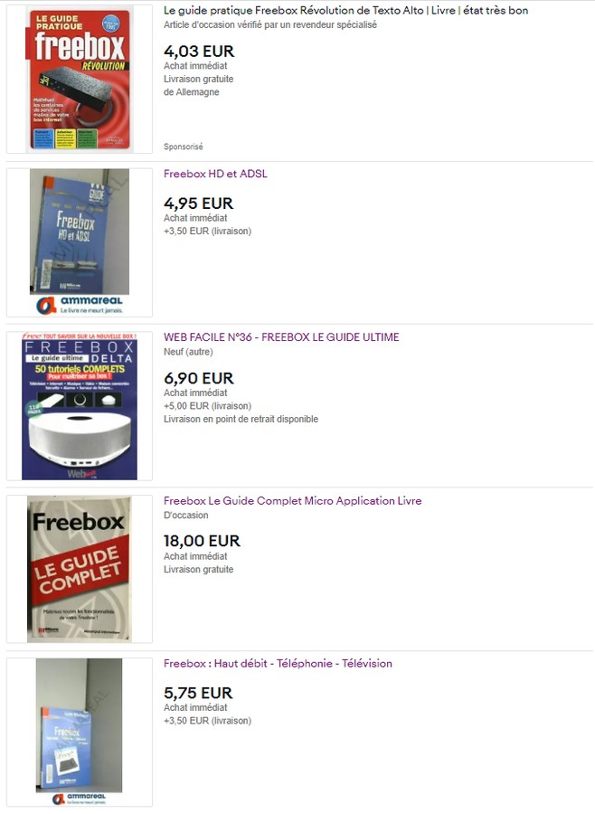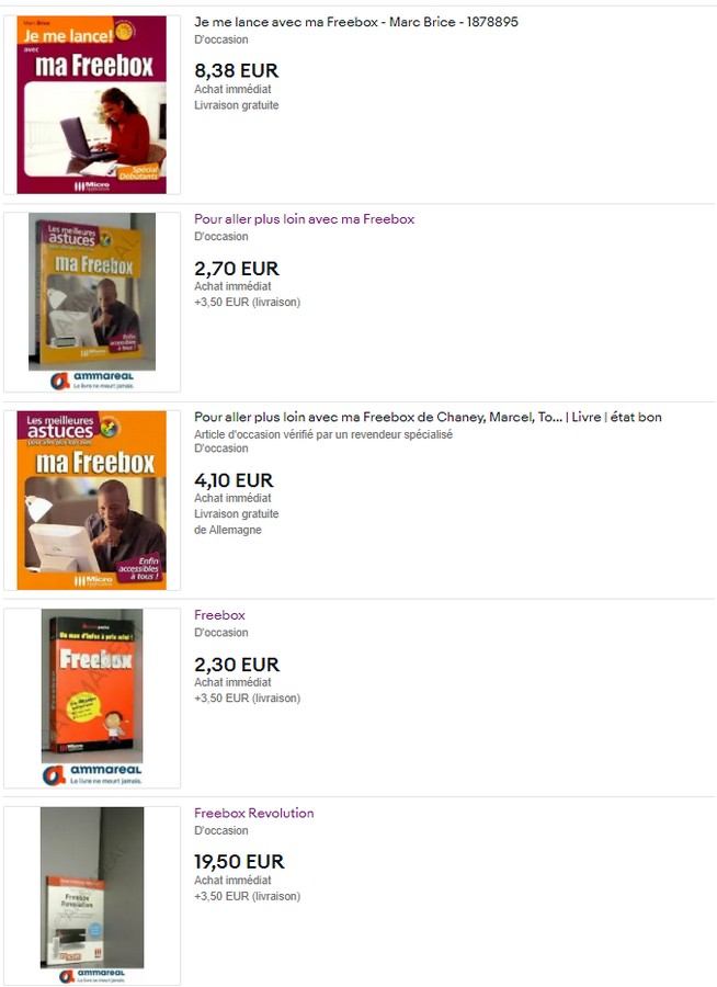 Lors d’une recherche sur eBay et sur Amazon, nous avons en effet trouvé un petit paquet de livres autour de la Freebox Révolution, la box emblématique de l’opérateur.