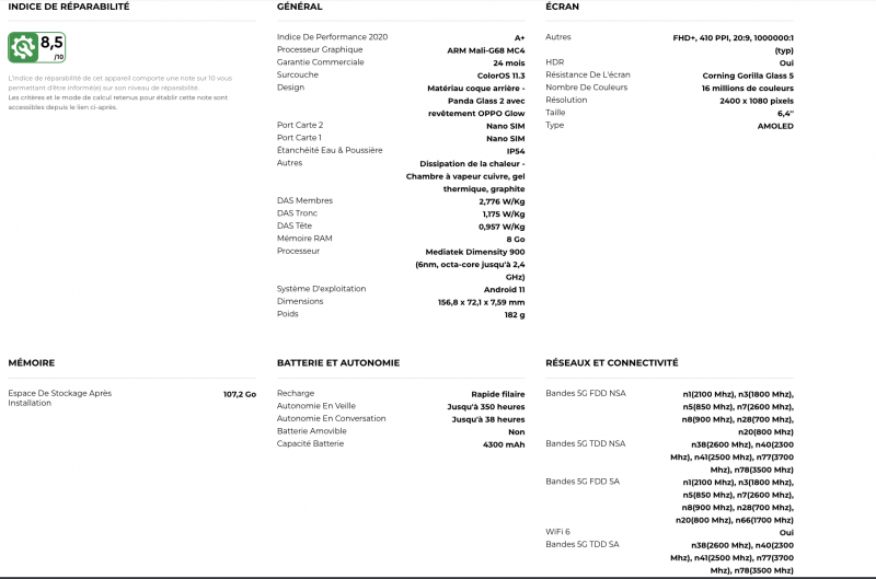 Ses points forts, son design ultra fin, mais aussi sa partie photo et son mode portrait, un capteur de température des couleurs est intégré pour soutenir son capteur principal de 64 MP ou son ultra grand-angle de 8 MP. La charge rapide SuperVooc 2.0, 65W chargera ce smartphone à 100% en seulement 28 minutes, promet le fabricant. Ce modèle dispose d’un batterie de 4300 mAh. Son processeur aussi tient la route (Mediatek Dimensity 900) et sa compatibilité WiFi 6 est un vrai plus.