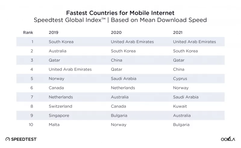 Depuis 2019, le top 10 des pays ayant l’internet mobile le plus rapide reste plus ou moins constant, avec notamment la Corée du Sud et les Émirats arabes occupant à tour de rôle la première et seconde place du classement. De son côté, la France n’a toujours pas atteint ce haut du classement et se place actuellement 27e avec un débit moyen en téléchargement de 73,27 Mbps. L’Hexagone ne s’est d’ailleurs pas vraiment amélioré en comparaison des autres pays, ayant perdu deux places dans le classement. À titre de comparaison, les Émirats arabes en tête du classement proposent un débit moyen de 190,03 Mbps.