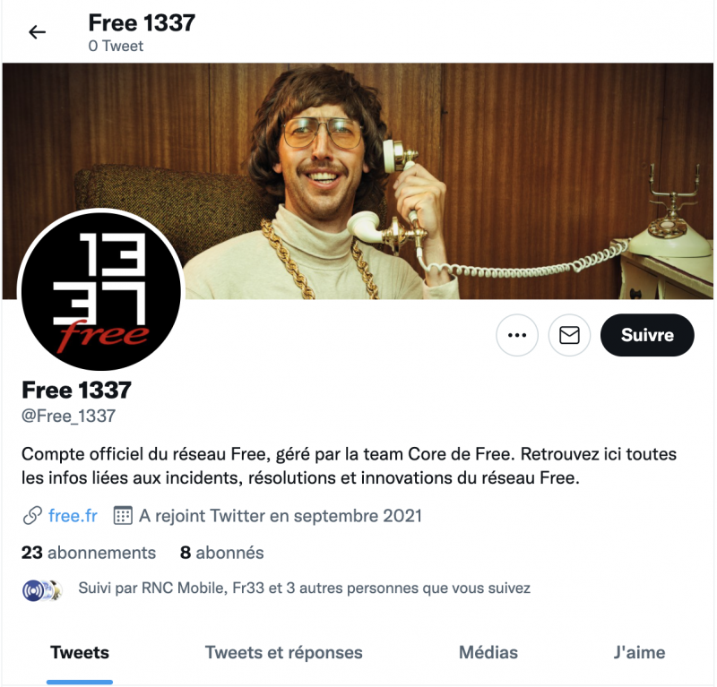 La communication de Free s’améliore. Après ses comptes régionaux pour informer de l’arrivée de sa fibre et de sa 5G dans les communes françaises, l’opérateur lance cette fois sur l’oiseau bleu un compte officiel dédié aux “incidents, résolutions et innovations du réseau Free” , annonce t-il. Baptisé “Free 1337“, en référence à l’heure affichée sur les boitiers Freebox Révolution signifiant Leet speak en langage Leet Speak soit « langage d’élite » en français, ce dernier est n’est pas encore alimenté mais le sera très prochainement.