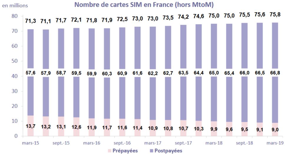 Les chiffres publiés par l’ARCEP, publiés aujourd’hui le 9 mai 2019 ont dévoilé que sur les 75.8 millions de cartes SIM en service en France à la fin du mois de mars 2019, 66,8 millions étaient des abonnements avec ou sans engagement, le reste étant des forfaits prépayés. Pour comparer : au premier janvier 2019, le nombre de français était estimé à 67,19 millions d’habitants. Des chiffres surprenants donc, si bien qu’on en vient à se demander quand le nombre d’abonnements dépassera-t-il celui d’habitants en France.