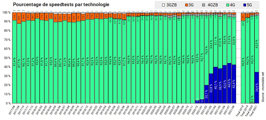 La part des mesures de débits 5G a atteint les 42,4 % (5 014) en août et celle des mesures de débits 4G les 52,8 % (6 234). À comparer aux 42 % des mesures 5G et 55,4 % de mesures 4G en juin, puis aux 44,3 % des mesures 5G et 51 % de mesures 4G en juillet.