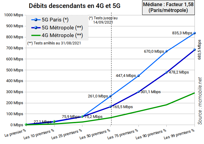 En revanche dès lorsque l’on se dirige vers la médiane (50% des tests), le débit passe de 165,5Mbps en national à 261Mbps à Paris. Cette évolution traduit la plus grande proportion de sites équipés en 3.5GHz à Paris (37% techniquement opérationnel : 75 sur 202 sites) au 10/09/2021 qu’en région (13,7% : 1575 sur 114501 sites) la progression est ainsi d’un facteur de 1.58 entre les 2.