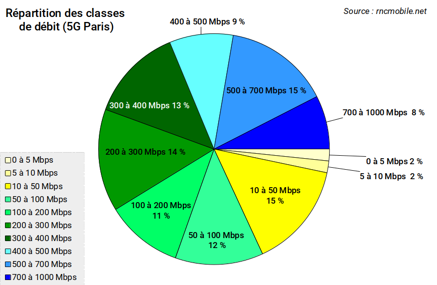 Selon la méthode de RNCMobile qui s’appuie sur 851 mesures, la situation Parisienne (bleu clair) colle de très près à la situation nationale (bleu foncé) pour les mesures de débit les plus faibles (moins de 75 Mbps : 25% des tests dans les deux cas).