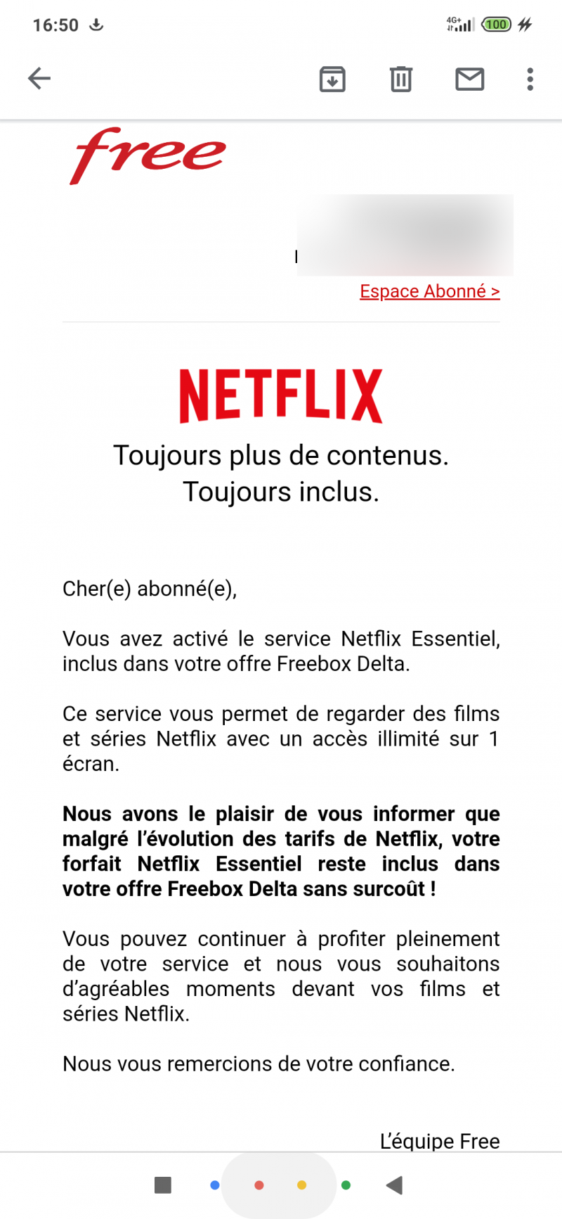 Pour rappel, en début de mois le géant du streaming a annoncé une hausse générale de ses tarifs, y compris de l’offre Essentiel, passant de 7.99€/mois à 8.99€/mois. Dans un mail envoyé aux abonnés concernés , Free met ainsi les choses au clair : si vous avez conservé votre abonnement Essentiel inclus dans l’offre Freebox Delta ou One, aucun surcoût ne sera appliqué.