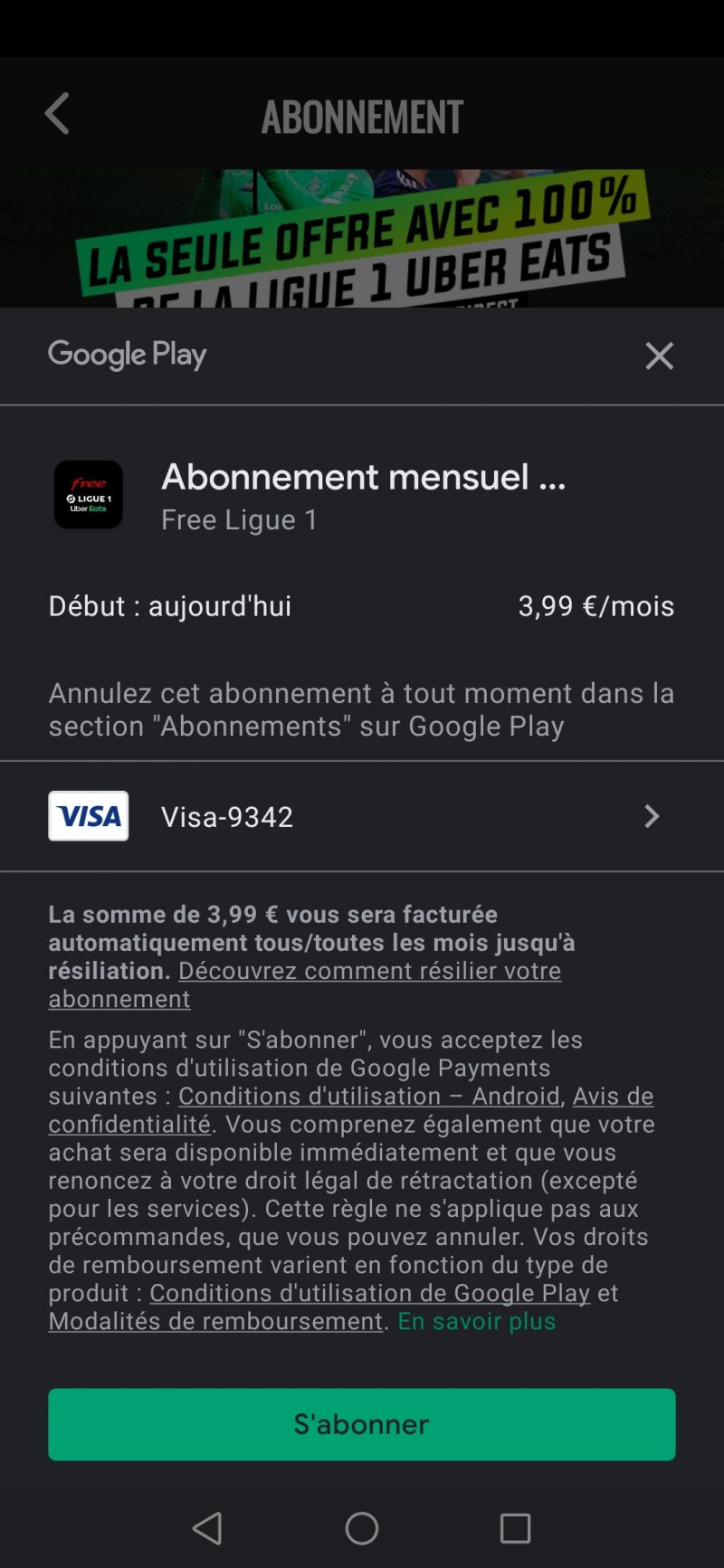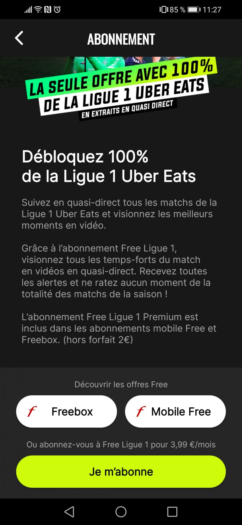 Comme prévu et après 5 premières journées offertes, l’abonnement à Free Ligue 1 Uber Eats fait son apparition sur mobile.