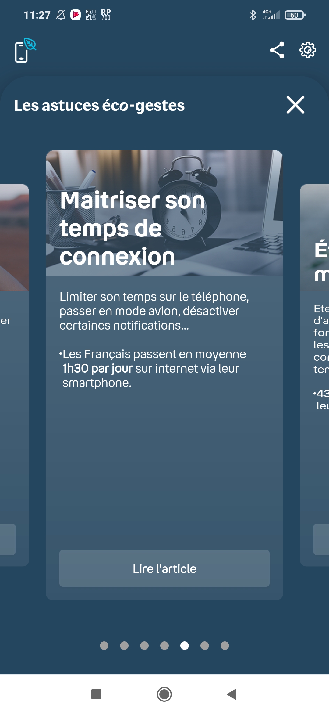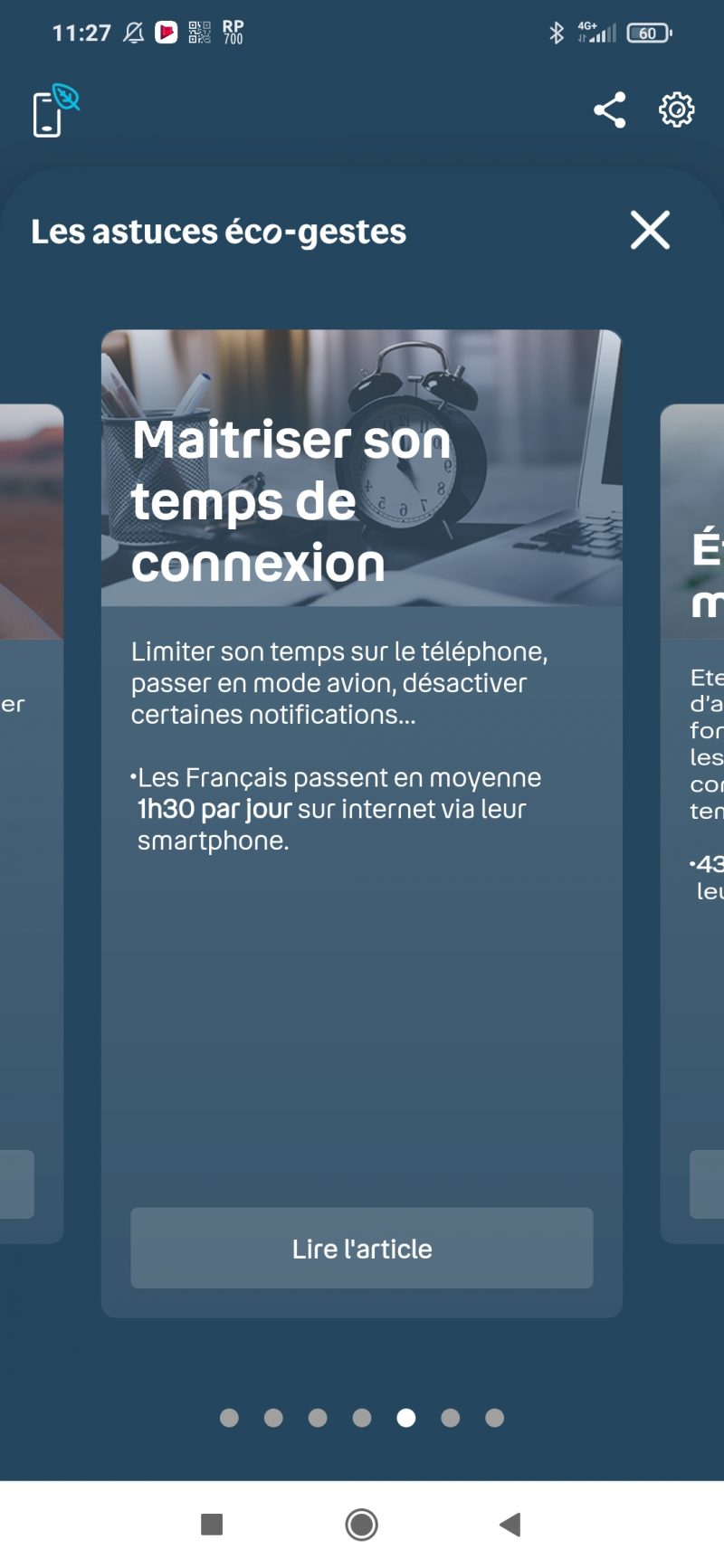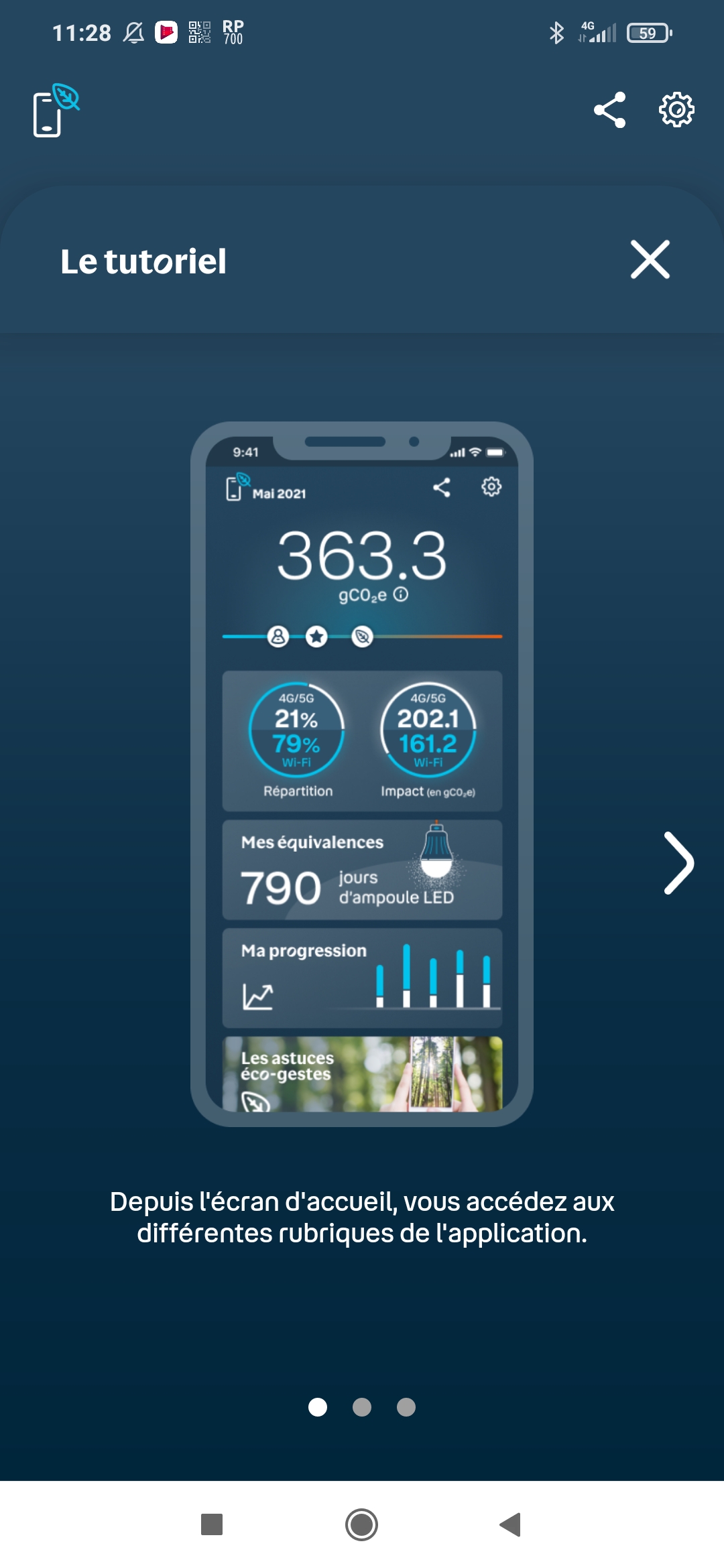 La partie inférieure de l’interface renvoie vers une section d’astuces éco-gestes présentées en carrousel (Privilégier le Wi-Fi, Ralentir les vidéos, Supprimer le superflu du cloud, Maîtriser son temps de connexion, etc.), un tutoriel affiché en carrousel (celui affiché au premier démarrage) et aux solutions de Bouygues Telecom (reprise du mobile, vente de mobiles reconditionnés et réparation de smartphones). Vous pourrez également répondre à un questionnaire sur votre expérience et faire des suggestions pour améliorer l’application.
