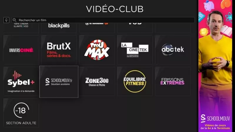 Pour commencer, il va falloir s’abonner au service. Après être allé dans le vidéo club de la Freebox, il suffira de chercher l’icône du service. SchoolMouv est accessible aux abonnés Freebox Révolution, Freebox Delta (avec player Devialet) et Freebox One