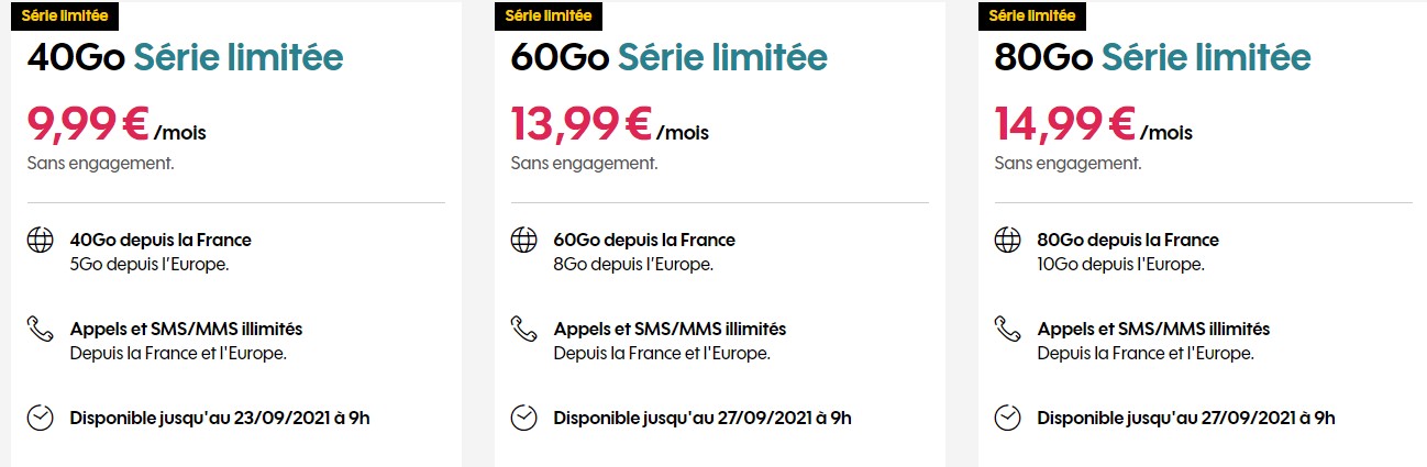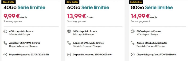 Depuis début septembre, Sosh propose deux séries limitées 60 et 80 Go à 13,99 et 14,99 euros par mois. Elles sont, pour rappel, valables jusqu’au 27 septembre 2021.
