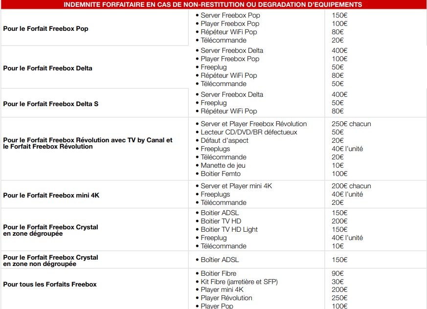 D’après la brochure tarifaire rendue disponible pour l’opérateur, il faut ainsi débourser 400 euros pour un serveur Freebox Delta, 250 euros pour un serveur Freebox Révolution, 200 euros pour un serveur Freebox mini 4K et 150 euros pour un serveur Freebox Pop. Les players Freebox Révolution, Freebox mini 4K et Freebox Pop coûteront 250, 200 et 100 euros respectivement. Des frais peuvent en outre s’appliquer pour la dégradation du matériel avec, par exemple, 50 euros pour un lecteur Blu-ray défectueux sur un player Freebox Révolution ou un défaut d’aspect sur le matériel Freebox Révolution. Les indemnités forfaitaires concernent aussi les autres équipements, comme le répéteur Wi-Fi (80 euros), la télécommande du player (10 euros à 50 euros), les Freeplugs (40 à 50 euros), les manettes de jeu (10 euros), le boîtier fibre (90 euros), le kit fibre Jarretière + SPF (30 euros) et le boîtier Femto (100 euros).