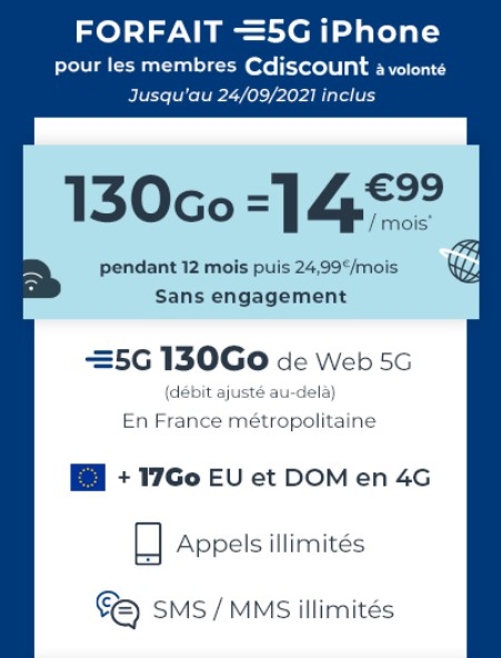 Jusqu’au 24 septembre 2021, Cdiscount Mobile propose ainsi un forfait 5G 130 Go à 14,99 euros pendant 12 mois, puis 24,99 euros par mois. Sans engagement, le forfait comprend plus précisément les appels, SMS et MMS en illimité, 130 Go de data en 5G depuis la France (débit ajusté au-delà) et 17 Go de data en 4G en roaming depuis l’Europe et les DOM.