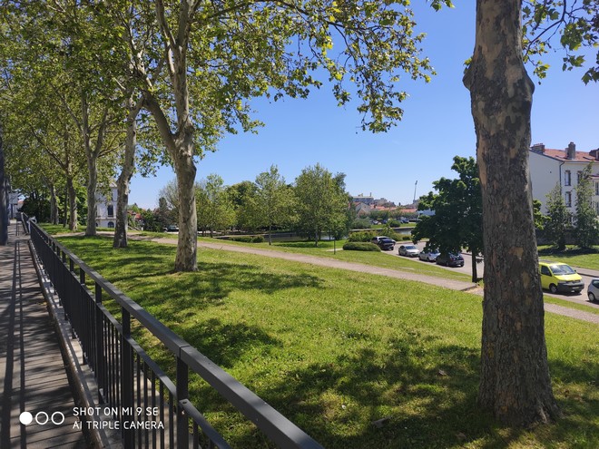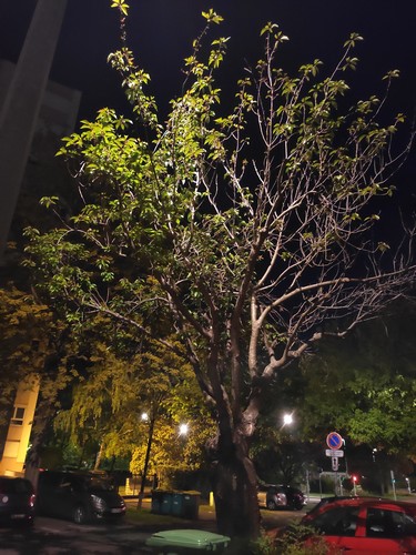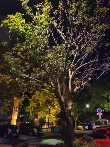 En mode nuit, sans puis avec traitement par l’intelligence artificielle (qui atténue les halos de lumière autour au niveau de lampadaires, renforce un peu le vert des arbres et éclaircit certaines zones sombres) :