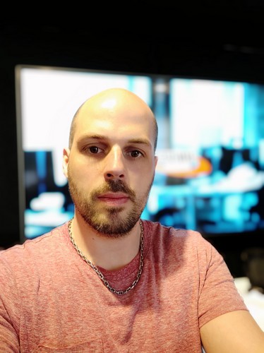 Un exemple de selfie en intérieur, avec l’effet de flou d’arrière-plan poussé au maximum :