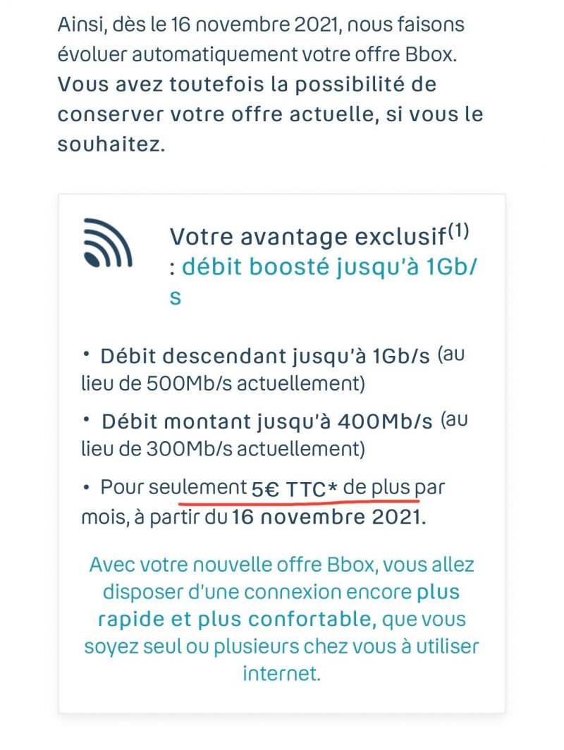 Certains abonnés Bbox se voient d’ailleurs proposer un avantage exclusif “débit boosté jusqu’à 1 Gb/s” pour “une connexion encore plus rapide et plus confortable”. Pour 5 euros de plus sur la facture mensuelle, ils peuvent ainsi voir leurs débits passer à 1 Gbit/s contre 500 Mbit/s (en réception) et 400 Mbit/s au lieu de 300 Mbit/s (en émission). Le changement prendra automatiquement effet le 16 novembre 2021.