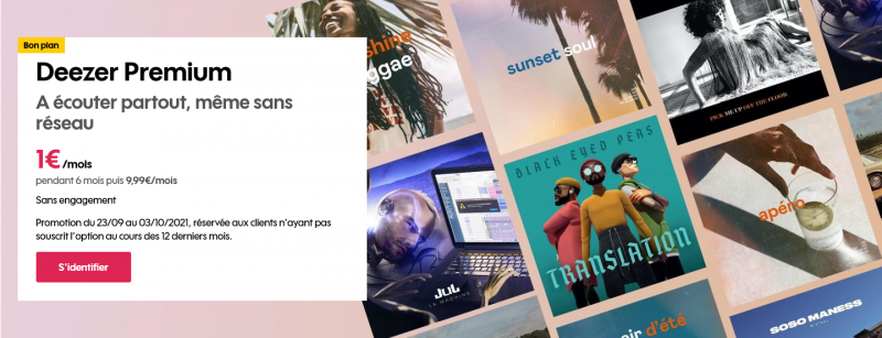 Une nouvelle vente flash pour l’opérateur historique destinées aux mélomanes ou à ceux qui veulent se détendre. Orange propose dès aujourd’hui et jusqu’au 3 octobre prochain son option Deezer Premium à 1€ par mois au lieu de 9.99€/mois pendant six mois, sous réserve de ne pas avoir souscrit l’option durant les 12 derniers mois , le tout sans engagement. Une fois la période promotionnelle passée, le tarif reviendra à la normale.