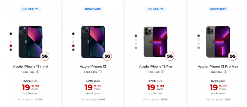 - iPhone 13 Pro Max : 679 euros puis 19,99 euros pendant 24 mois (128 Go), 799 euros puis 19,99 euros pendant 24 mois (256 Go) ou 1 029 euros puis 19,99 euros pendant 24 mois (512 Go)