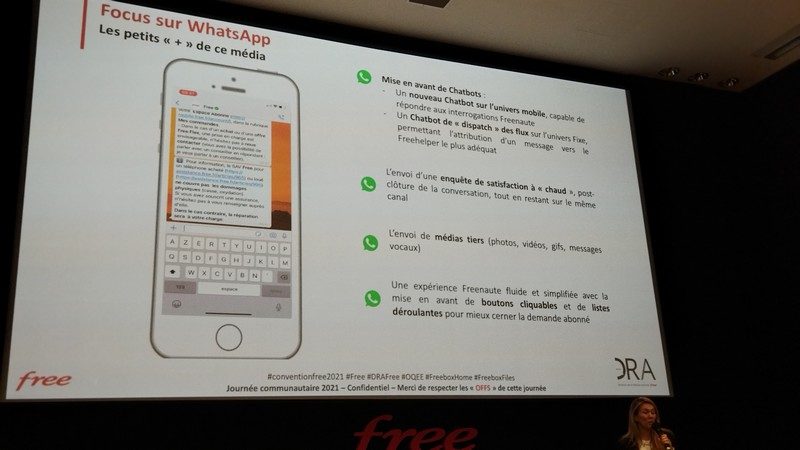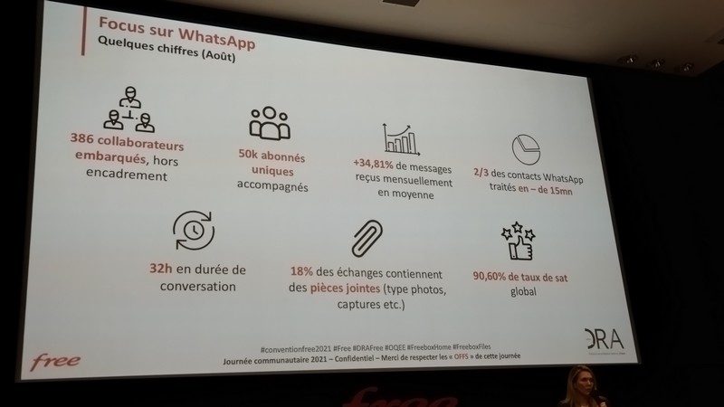Lors de la convention des communautés Free du week-end dernier, l’opérateur a d’ailleurs donné quelques chiffres concernant son assistance via WhatsApp : 386 collaborateurs (hors encadrement), 50 000 utilisateurs accompagnés, 2 tiers des demandes traitées en moins de 15 minutes et 18 % des échanges contenant des pièces jointes telles que des photos ou des captures d’écran. L’appétence pour ce nouveau canal d’assistance se traduit également dans les chiffres fournis par l’opérateur : + 34,81 % de messages reçus mensuellement en moyenne. La satisfaction est également notable : 90,60 % au global.