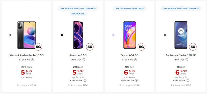 Univers Freebox vous propose régulièrement des comparatifs pour vous aider à vous y retrouver parmi les smartphones vendus via la boutique de Free Mobile. Il s’agit de vous aider à choisir selon vos attentes. Aujourd’hui, nous allons regarder les modèles 5G disponibles à moins de 250 euros, rendant ainsi la technologie accessible aux petits budgets. Ils sont au nombre de quatre : le Xiaomi Redmi Note 10 5G à 199 euros, le Realme 8 5G à 219 euros, l’Oppo A54 5G à 229 euros et le Motorola Moto G50 5G à 249 euros. Notez d’ailleurs qu’ils sont disponibles au comptant ou via la nouvelle offre Free Flex.
