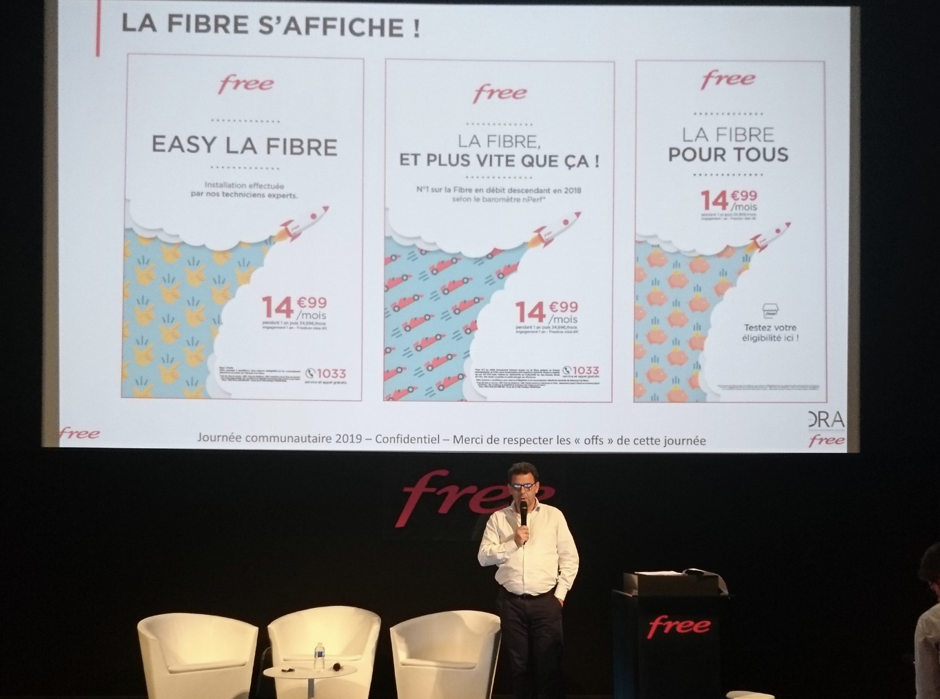 Après un petit jeu de questions-réponses autour du sujet, Thibault Gentien, directeur des ventes Fibre, nous a présenté les objectifs de la fibre de Free, de la stratégie de l’opérateur dans les zones rurales avec des affiches plus localisées pour prévenir de l’arrivée du FTTH dans les villes. L’occasion de découvrir le calendrier de déploiement de l’opérateur en ZTD et sur les RIP dans les 3 prochains mois.