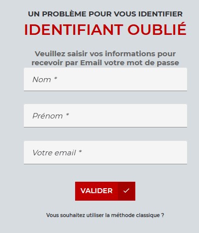 En cliquant sur “Vous avez oublié votre mot de passe ou perdu vos identifiants ?“, il vous sera proposé un renvoi de votre mot de passe après saisie de l’identifiant à 8 chiffres et de l’e-mail.