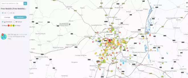 Selon les résultats des tests effectués par les abonnés Free Mobile, les zones rouges ont un débit inférieur à 20Mb/s, pour les zones jaunes le débit est compris entre 20 et 60Mb/s et pour les zones vertes le débit est au dessus de 60Mb/s.