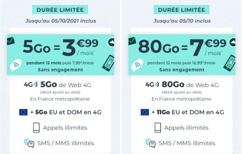 Dans le détail, le forfait à 3,99 euros propose les appels, SMS et MMS illimités, ainsi que 5 Go de data depuis la France (débit réduit au-delà) et 5 Go en roaming depuis l’Europe et les DOM. Celui-ci à 7,99 euros inclut les appels, SMS et MMS illimités, ainsi que 80 Go de data depuis la France (débit réduit au-delà) et 11 Go en roaming depuis l’Europe et les DOM.