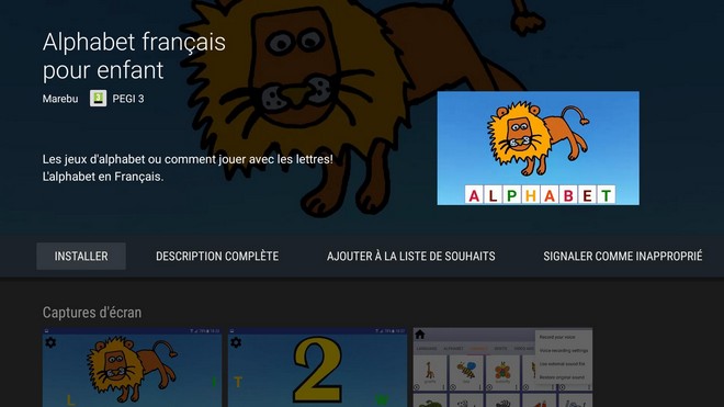VERDICT : gratuite, légère, utilisable à la télécommande ou à la manette et personnalisable en ce qui concerne les sons, l’application Alphabet a tous les arguments pour intéresser les parents souhaitant initier les enfants à l’alphabet et aux mots. On regrette juste la lenteur dans l’activité la plus intéressante – Mots croisés – parmi les quatre disponibles.