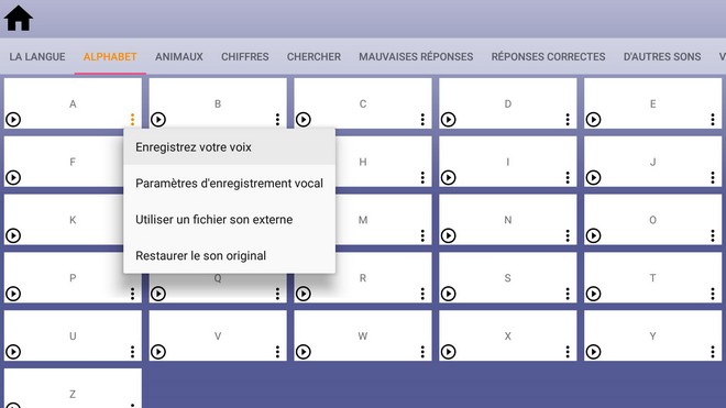 Pour les parents qui le souhaitent, il est possible d’aller dans les paramètres de l’application pour réenregistrer les sons avec leur propre voix, avec un enregistrement grâce au microphone de la télécommande. Pourquoi pas. Au cas où, on pourra remettre les sons d’origine.