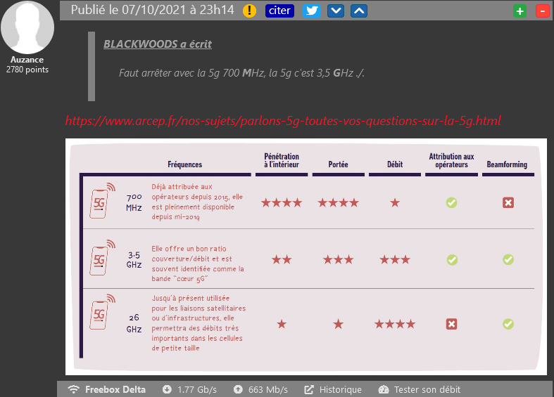 Le déploiement de la 5G chez Free Mobile s’est fait très rapidement depuis la fin de l’année dernière, grâce notamment à l’utilisation de la bande-fréquence 700 MHz. Cependant certains lecteurs ont la tête dure et persistent en annonçant que l’utilisation de cette bande-fréquence déjà utilisée en 4G rend inepte l’appellation 5G. Puisque une image vaut mieux que milles mots, Auzance décide alors de mettre les choses au clair en citant directement le régulateur des télécoms : oui, la 5G 700 MHz est de la vraie 5G ! De quoi, on espère, mettre fin au débat. Quant à l’utilisation de la 3.5 GHz, Free reste deuxième dans son déploiement.