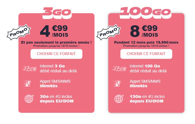 Jusqu’au 12 octobre 2021, NRJ Mobile commercialise des forfaits 3 et 100 Go à 4,99 et 8,99 euros. Si les prix restent intéressants, ils le sont moins par rapport à de précédentes offres 7 et 150 Go à 4,99 et 8,99 euros.
