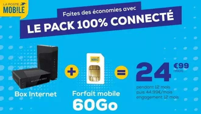 La Poste Mobile propose son pack 100 % connecté. Disponible à partir de 16,99 euros par mois, au lieu de 36,99 euros par mois, il comprend un forfait fixe et un forfait mobile.