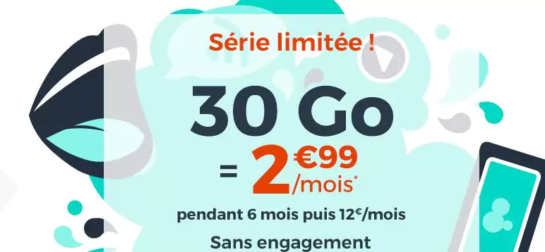 Le forfait inclut les appels, SMS et MMS en illimité, ainsi qu’une enveloppe de 30 Go à utiliser en France avec des débits 3G/4G (selon la couverture disponible). Pour les autres pays de l’Union européenne, il propose une enveloppe supplémentaire de 3 Go et des débits 3G/3G+.