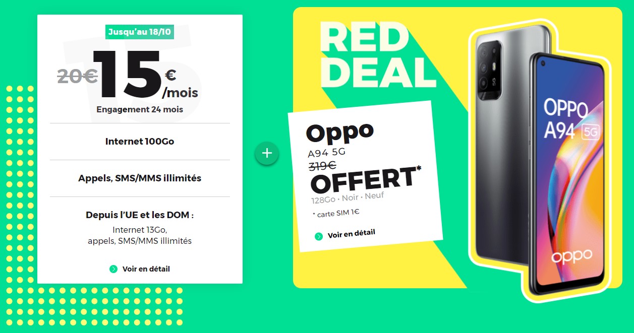 Jusqu’au 18 octobre 2021, Red by SFR propose un nouveau Red Deal avec un smartphone offert en contrepartie d’un engagement de 24 mois. Le forfait 100 Go associé coûte 15 euros par mois et le smartphone est un modèle Oppo A94 5G 128 Go noir à l’état neuf d’une valeur indicative de 319 euros. Univers Freebox vous avait d’ailleurs proposé un test complet de ce smartphone 5G.