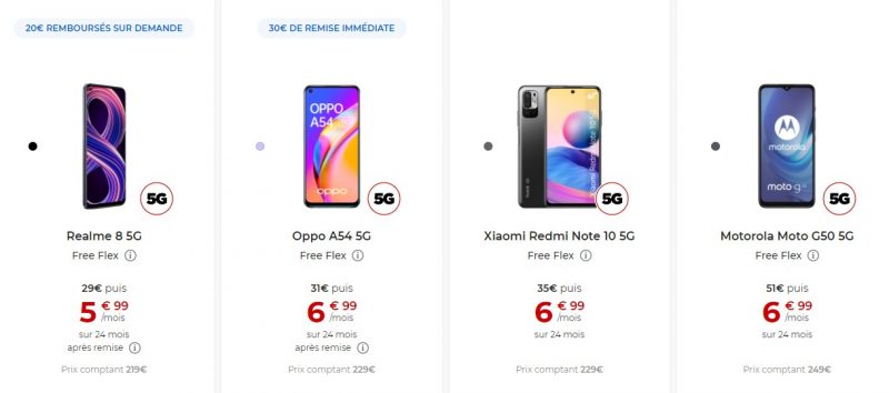Avec le choc des smartphones, Univers Freebox vous propose un comparatif des smartphones vendus à tarifs équivalents via la boutique de Free Mobile. Il s’agit de vous aider à choisir selon vos attentes. Aujourd’hui, nous regardons ce qu’il est possible d’avoir comme smartphone 5G pour moins de 250 euros. Nous opposons ainsi les Realme 8 5G, Oppo A54 5G, Xiaomi Redmi Note 10 5G et Motorola Moto G50 5G affichés à 219, 229, 229 et 249 euros euros respectivement. Notez d’ailleurs qu’ils sont disponibles au comptant ou via la nouvelle offre Free Flex avec un coût de 5,99 ou 6,99 euros par mois selon le modèle.
