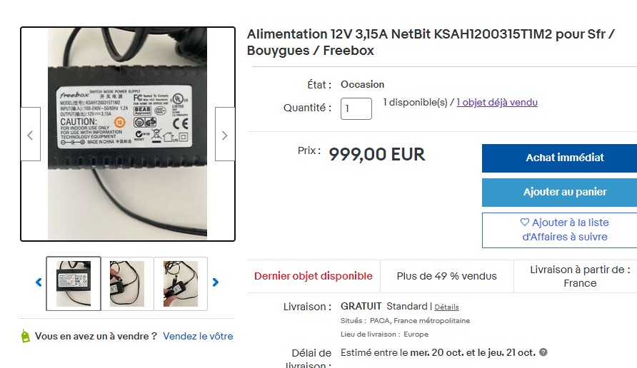 Mais la palme revient sans doute à ce vendeur sur eBay, présentant pourtant 100 % d’évaluations positives et indiqué comme “un des vendeurs les plus réputés d’eBay”. Il nous propose en effet un bloc d’alimentation Freebox à… 999 euros. Il pourrait d’ailleurs s’agir de l’alimentation de la Freebox HD, à laquelle ont aussi eu droit certains abonnés Freebox mini 4K.