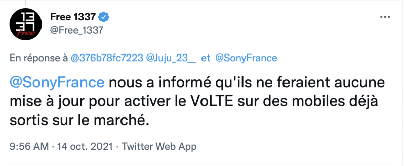 S’il est possible de retrouver sur une page dédiée les modèles compatibles et ceux à venir chez l’opérateur de Xavier Niel, une marque manque à l’appel : Sony. Si le constructeur japonais a activé la VoLTE d’Orange, SFR et Bouygues sur un certain nombre de ses modèles, Sony France a quant à lui informé Free Mobile qu’il ne fera “aucune mise à jour pour activer la VoLTE sur des mobiles déjà sortis sur le marché. Ni sur ceux à venir”, indique ce 14 octobre l’opérateur. Pour les abonnés désireux de profiter de la voix sur 4G de Free Mobile, il faudra donc éviter Sony.