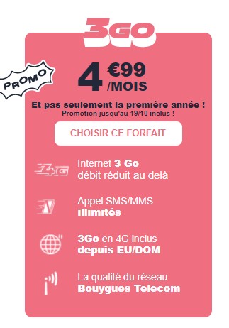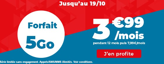 Quant à NRJ Mobile, il commercialise un forfait sans engagement à 4,99 euros par mois, avec l’indication “et pas seulement la première année”. Disponible jusqu’au 19 octobre, la formule comprend les appels, SMS et MMS illimités, ainsi que 3 Go de data utilisables en 3G/4G. Elle est utilisable en roaming depuis l’Europe et les DOM.