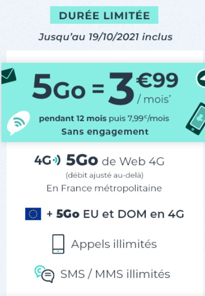 Également jusqu’au 19 octobre, Cdiscount Mobile propose la même offre qu’Auchan Telecom, à savoir un forfait sans engagement avec appel/SMS/MMS illimités + 5 Go de data pour 3,99 euros par mois, puis 7,99 euros après un an. Le forfait prévoit du roaming depuis l’Europe et les DOM.