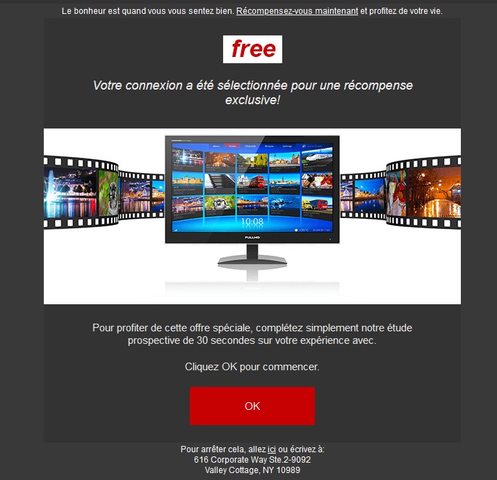 “Votre connexion a été sélectionnée pour une récompense exclusive! Pour profiter de cette offre spéciale, complétez simplement notre étude prospective de 30 secondes sur votre expérience avec”, annonce en effet l’e-mail ayant d’ailleurs pour objet “Nous voulons vous récompenser pour votre fidélité”. L’e-mail démarre même avec la petite suggestion suivante : “Le bonheur est quand vous vous sentez bien. Récompensez-vous maintenant et profitez de votre vie”.