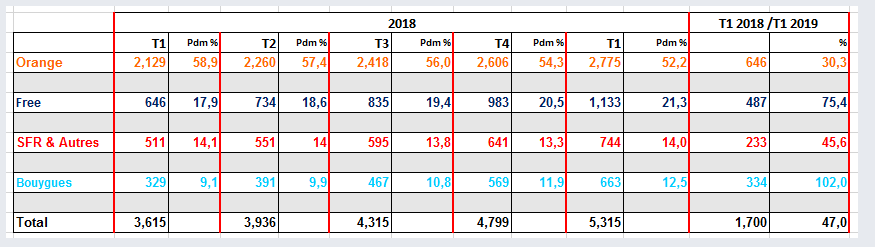 Dans le détail, l’opérateur historique voit son avance se réduire et perd 6,7 points sur 12 mois en s’adjugeant tout de même 52,2% de part de marché contre 56% en décembre dernier. "Si le phénomène se poursuit, Orange devrait passer rapidement sous les 50% de parts de marché", commente à ce propos le site communautaire. Avec 2,775 millions de clients, l’opérateur a enregistré un gain de 646 000 clients FTTH sur 12 mois soit une augmentation 30,3% de sa base clientèle du T1 2018 au T1 2019.