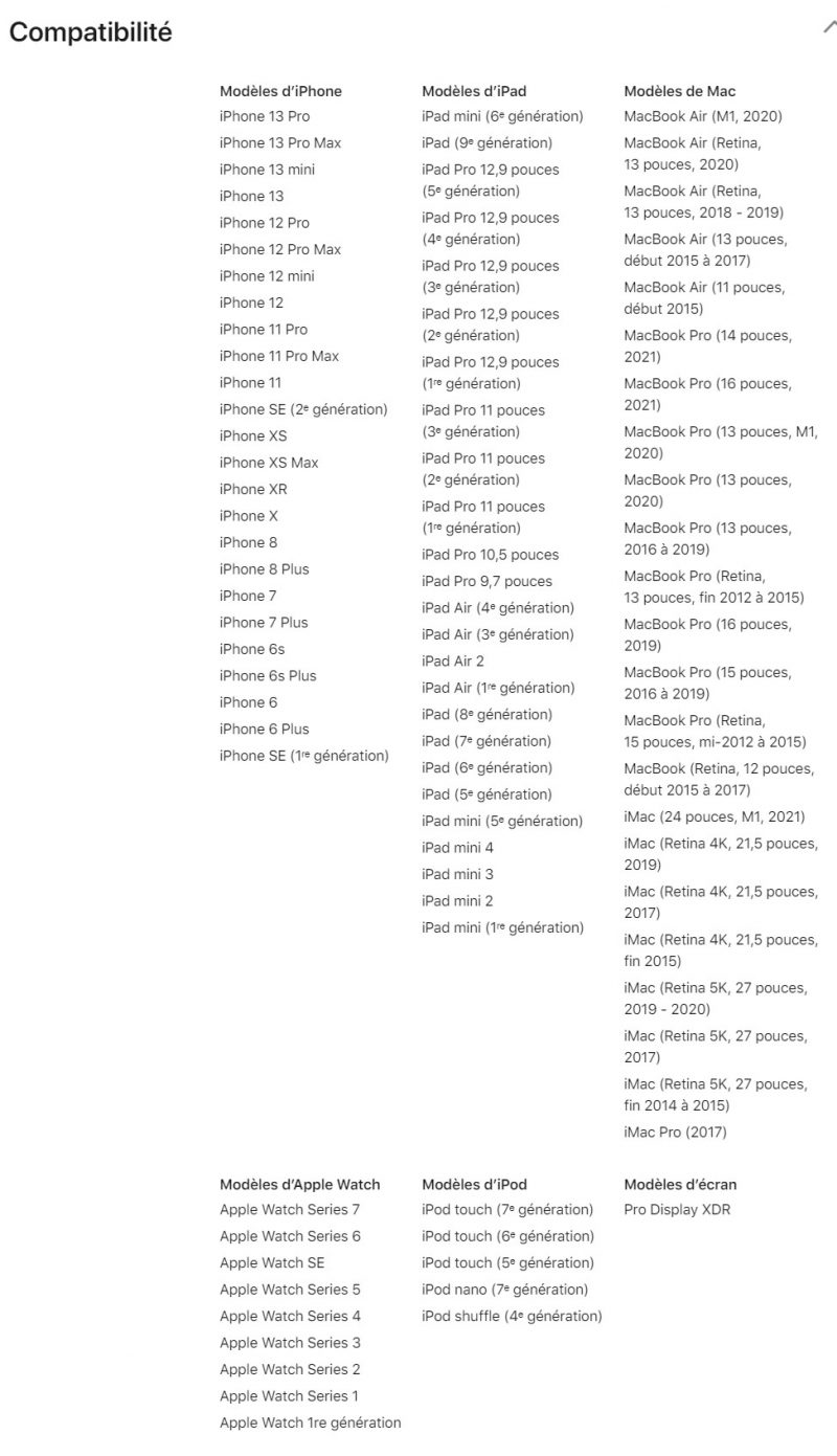 La firme californienne fournit même une liste d’appareils compatibles assez étoffée, incluant des iPhone, des iPad, des MacBook, des iMac, des Apple Watch, des iPod et un moniteur. Pensez donc à bien vérifier la présence du vôtre…