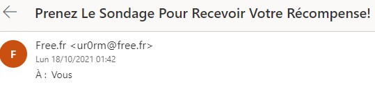 “Vous avez deux choix dans la vie : attendre d’être prêt ou sortir de votre zone de confort et essayerQuelque chose de nouveau!“, commence un e-mail ciblant les abonnés Free Mobile, sur un ton philosophique. Mais quelle est donc cette chose nouvelle à essayer ? “Nous Voulons Vous Récompenser Pour Votre Fidélité ! Pour bénéficier de cette offre spéciale, remplissez simplement notre enquête marketing de 30 secondes sur vos expériences avec FREE”, explique la missive, d’ailleurs reçue en plusieurs exemplaires.