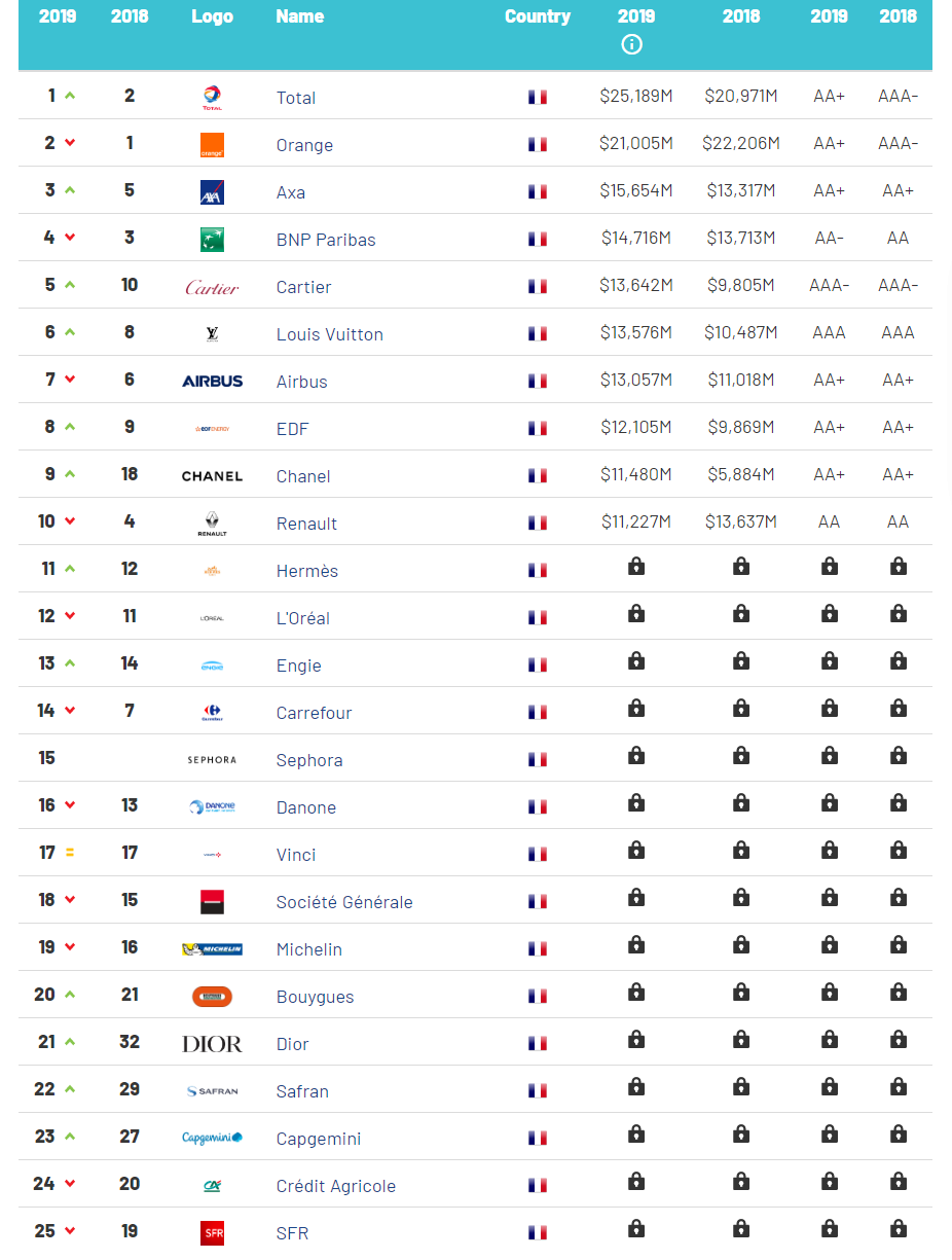 Brand Finance a par ailleurs établi un classement des 100 marques françaises les plus valorisées en évaluant "les revenus futurs potentiels attribuables à la marque”. En 2019, Orange perd son fauteuil de leader au profit de Total et ce après 4 années de domination . L’opérateur historique voit sa valeur baisser de 4,2% contre 1% l’année dernière. C’est “la conséquence d’un marché national des télécommunications saturé et ultra-concurrentiel et où la guerre des prix continue à faire rage entre les quatre acteurs, malgré les gains de 82 000 clients Mobile et 157 000 clients Fibre et un dynamisme insuffisant en Europe à l’exception de l’Espagne.”, justifie Brand Finance. De son côté, Bouygues gagne une place et se classe 20ème, SFR dégringole de 6 rangs en 25ème position. Enfin, Free passe de la 43ème à la 42ème place.